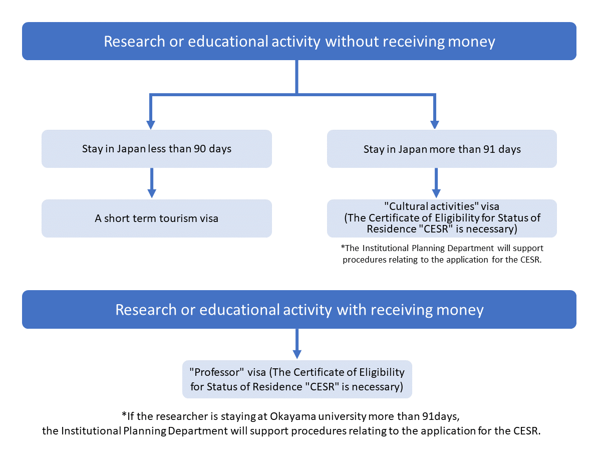 *International Researchers who engage in educational activities or research receiving some salary need to obtain a visa of “Professor” regardless of how long they stay in Japan
