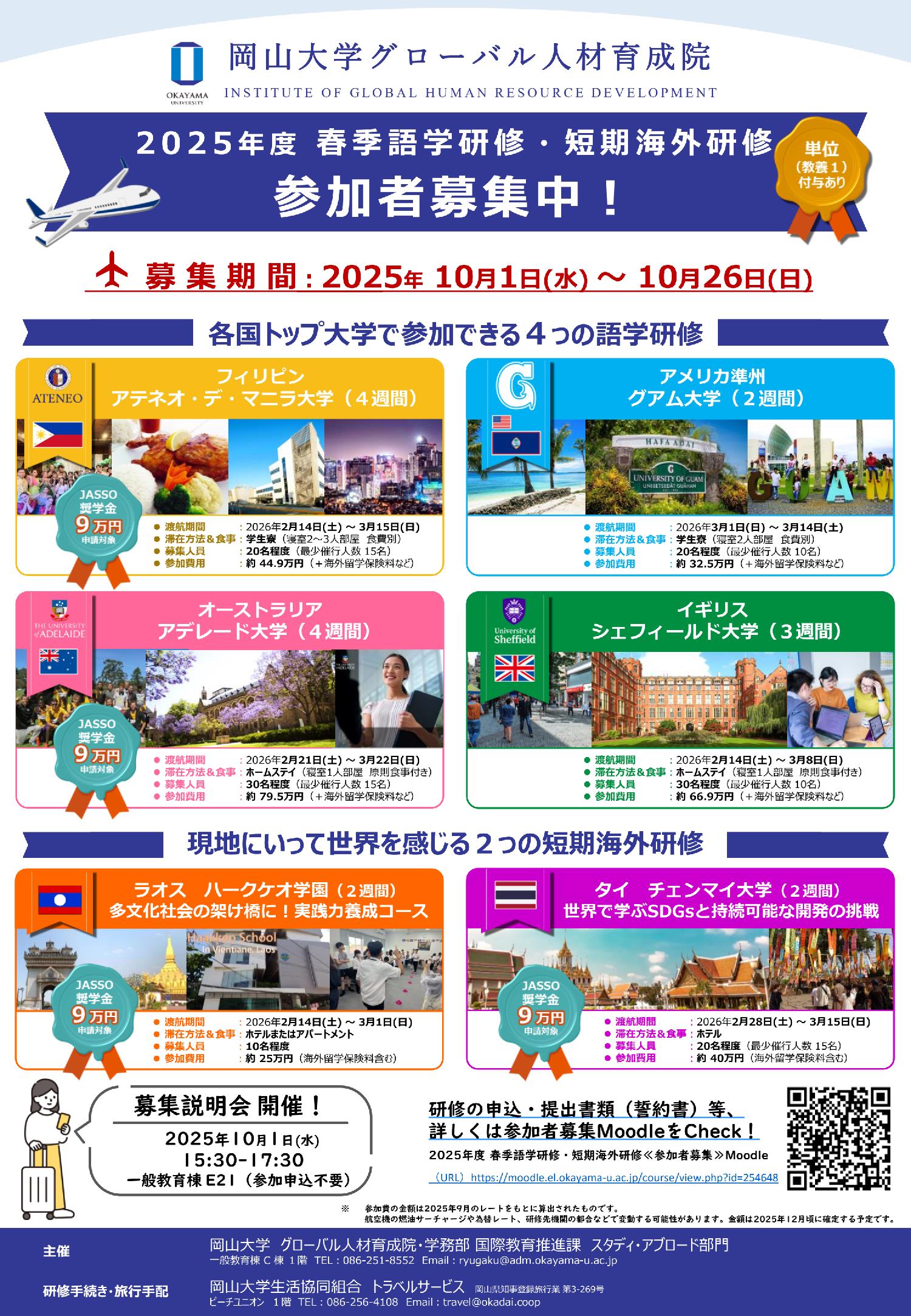 岡山大学グローバル人材育成院が実施する2025年度春季語学研修・短期海外研修の参加者を募集します!