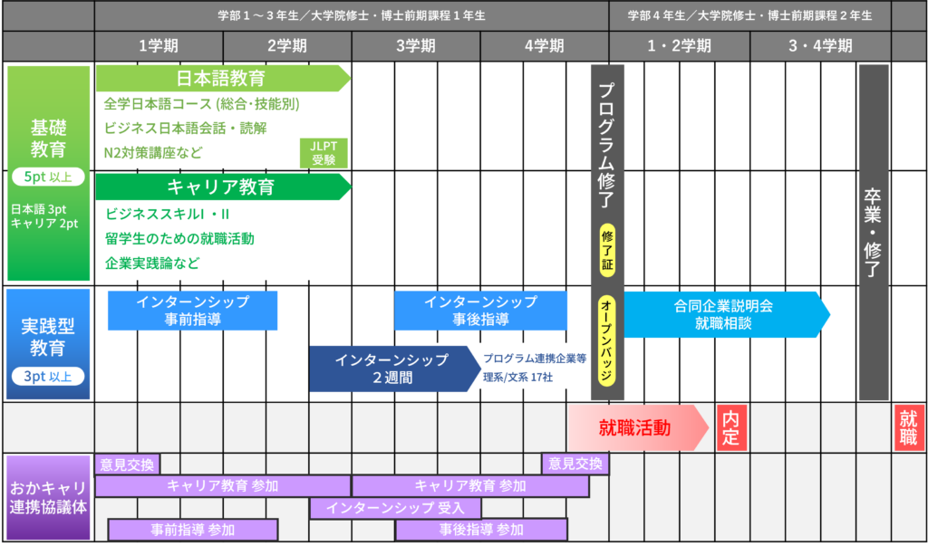 本プログラムは、日本語教育やキャリア教育からなる基礎教育と、インターンシップや事前・事後指導からなる実践型教育で構成されています。